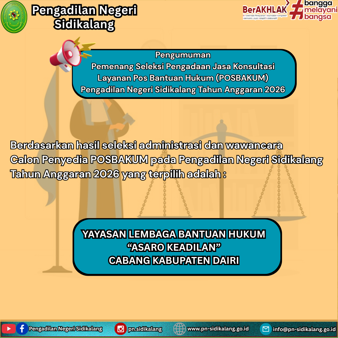 Berdasarkan amanat Pasal 23 Peraturan Mahkamah Agung RI Nomor 1 Tahun 2014 tentang Pedoman Pemberian Layanan Hukum Bagi Masyarakat Tidak Mampu di Pengadilan, dengan ini Pengadilan Negeri Sidikalang membuka Pendaftaran Calon Penyedia Jasa Pos bantuan Hukum (POSBAKUM) Tahun Anggaran 2026.