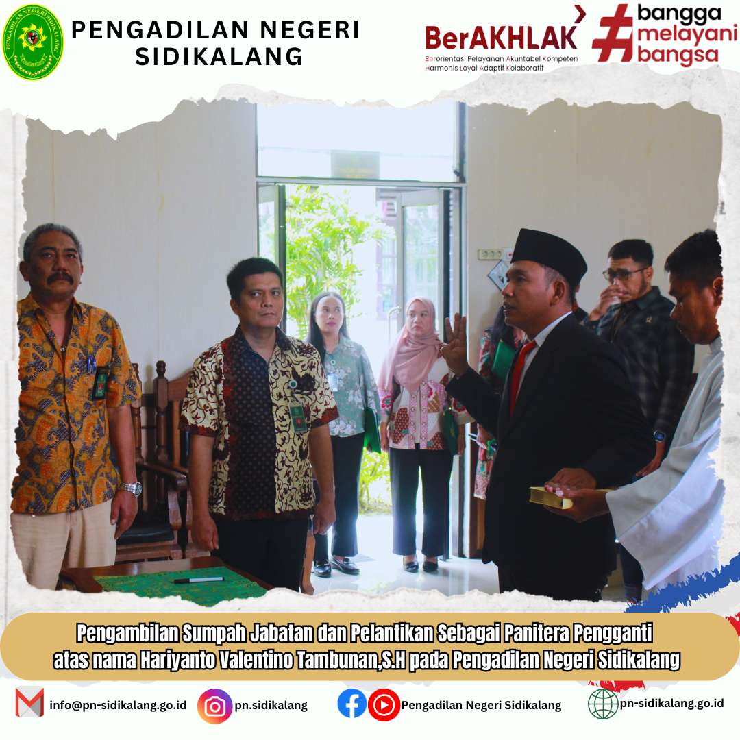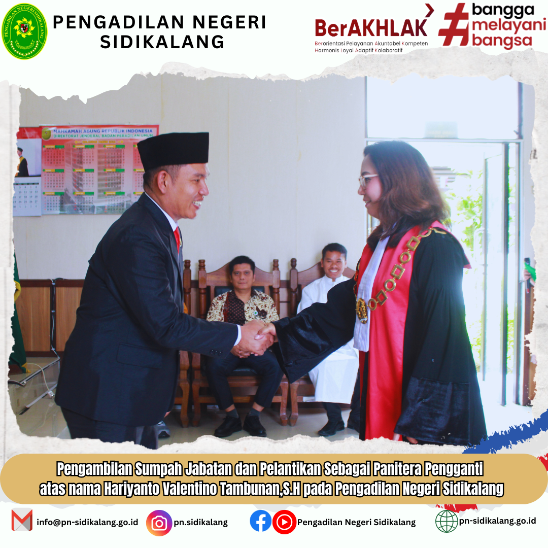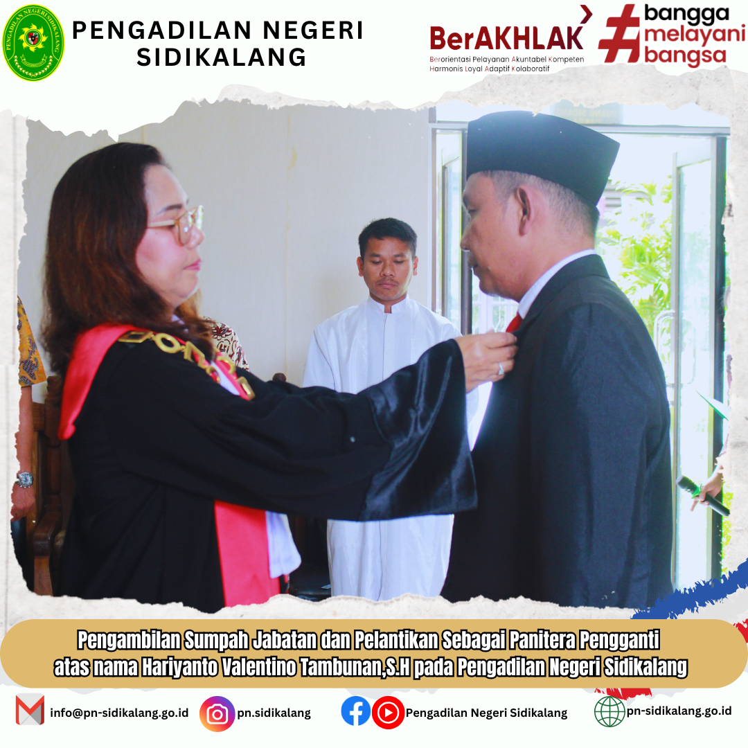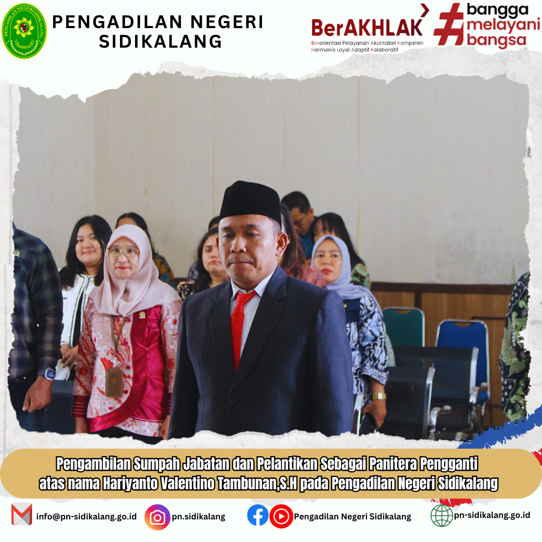 Pengadilan Negeri Sidikalang menggelar acara Pengambilan Sumpah Jabatan dan Pelantikan Bapak Hariyanto Valentino Tambunan, S.H. sebagai Panitera Pengganti pada Jumat, 19 September 2025, pukul 10.30 WIB. Prosesi berlangsung di Ruang Sidang Cakra dan dipimpin langsung oleh Ketua Pengadilan Negeri Sidikalang, Ibu Eva Rina Sihombing, S.H., M.H.