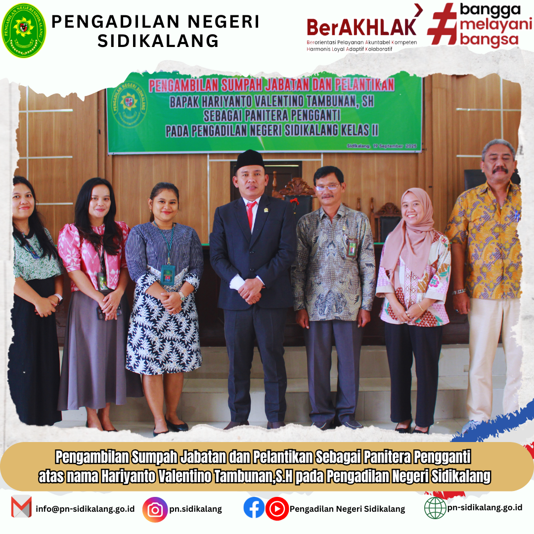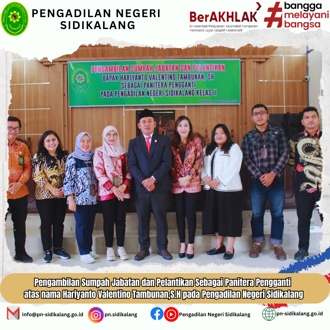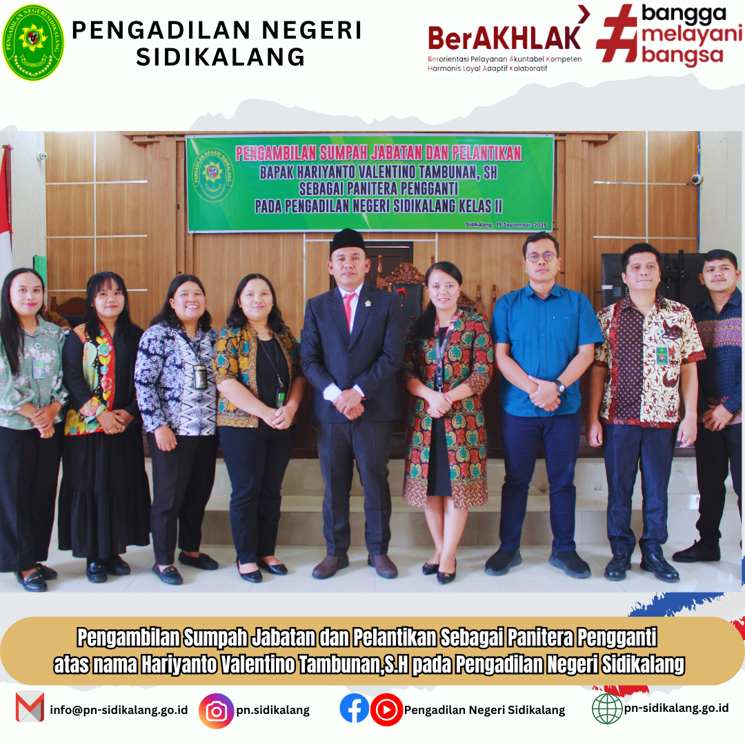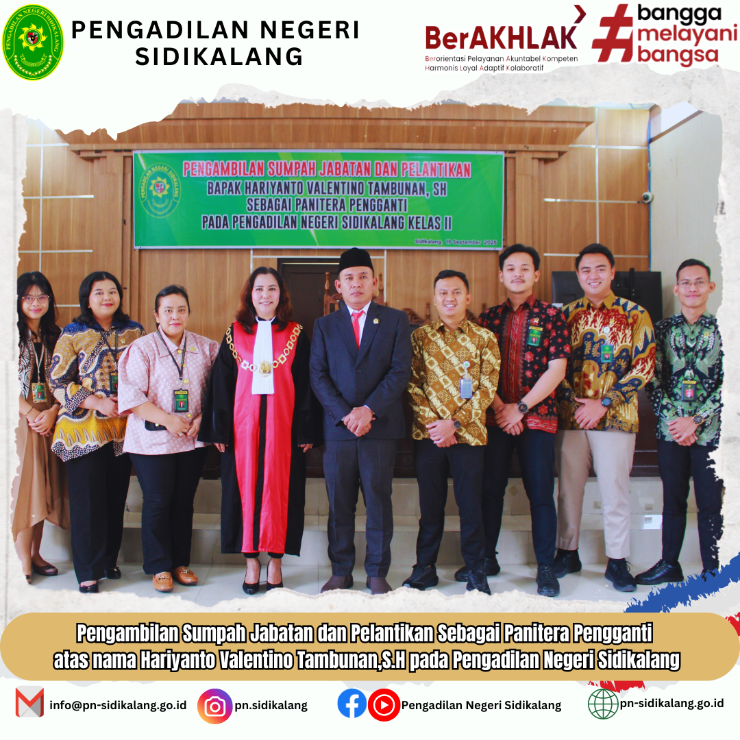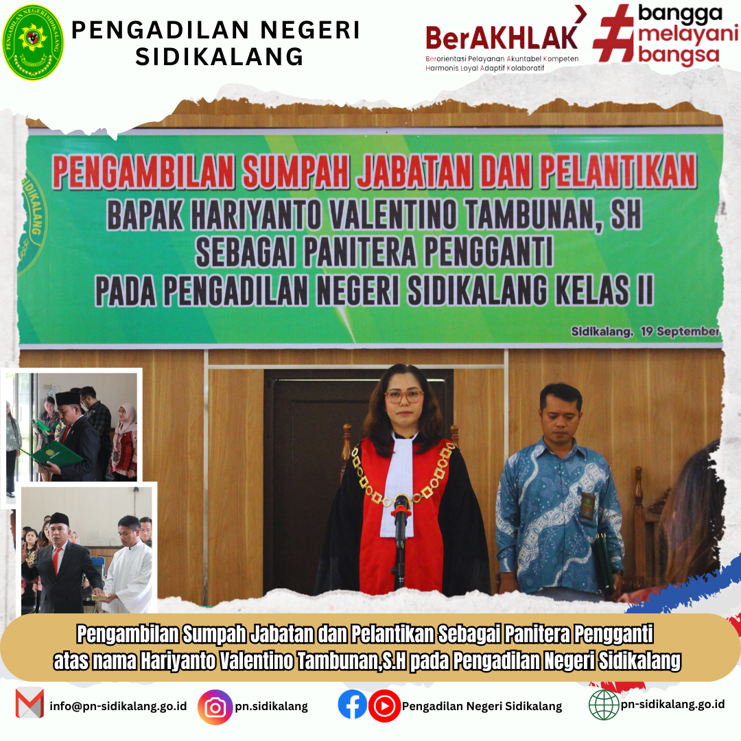 Pengadilan Negeri Sidikalang menggelar acara Pengambilan Sumpah Jabatan dan Pelantikan Bapak Hariyanto Valentino Tambunan, S.H. sebagai Panitera Pengganti pada Jumat, 19 September 2025, pukul 10.30 WIB. Prosesi berlangsung di Ruang Sidang Cakra dan dipimpin langsung oleh Ketua Pengadilan Negeri Sidikalang, Ibu Eva Rina Sihombing, S.H., M.H.